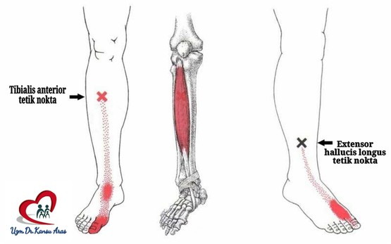 Bu kitabın ilk volümünde vücudun üst kısmı ile ilgiliydi.İlk kapakta kasların listesi ve bu kasların vücudun neresinde bulacağımızın görseli yer almaktaydı.Başparmakta ağrı olgusunda yansıyan ağrıya sebep olacak üç farklı kas bulunmaktadır: tibialis anterior , ekstensör hallucis longus ve fleksör hallucis brevis.Tibialis anterior yerleşimli bir tetik nokta ayak bileği ön-yüze ağrı yansıtır.Ekstensör hallucis longusun yansıyan alanı başparmağın dorsal yüzü olmaktadır.