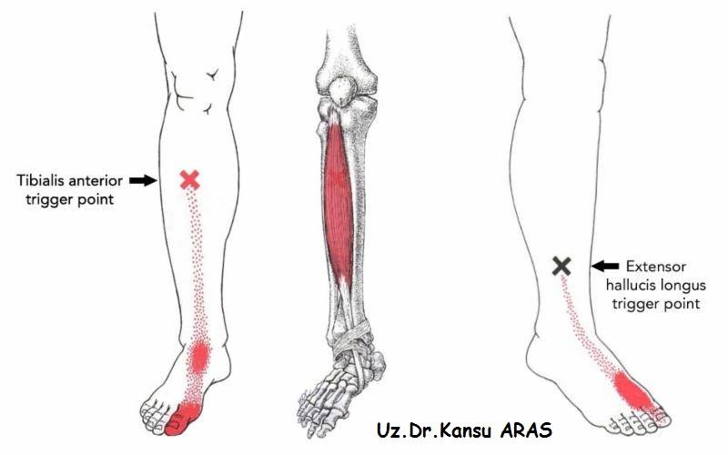 Bu kitabın ilk volümünde vücudun üst kısmı ile ilgiliydi.İlk kapakta kasların listesi ve bu kasların vücudun neresinde bulacağımızın görseli yer almaktaydı.Başparmakta ağrı olgusunda yansıyan ağrıya sebep olacak üç farklı kas bulunmaktadır: tibialis anterior , ekstensör hallucis longus ve fleksör hallucis brevis.Tibialis anterior yerleşimli bir tetik nokta ayak bileği ön-